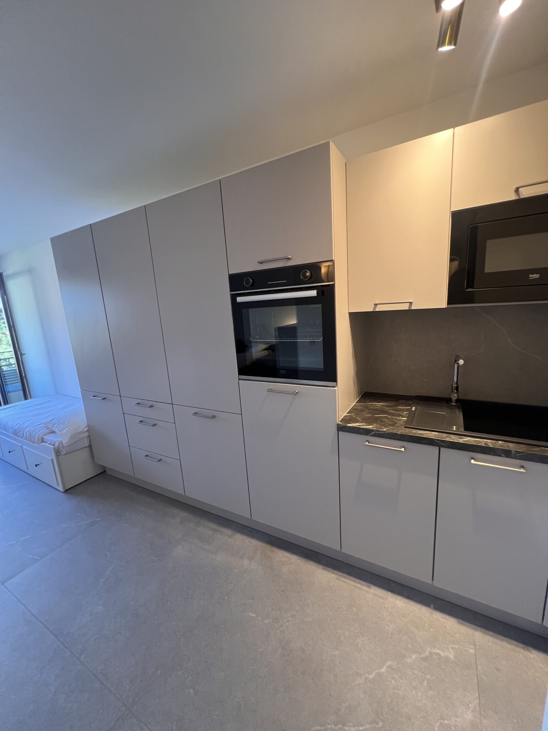 Cuisine ouverte sur séjour : plaques, four, micro-ondes, machine à laver, machine à café.