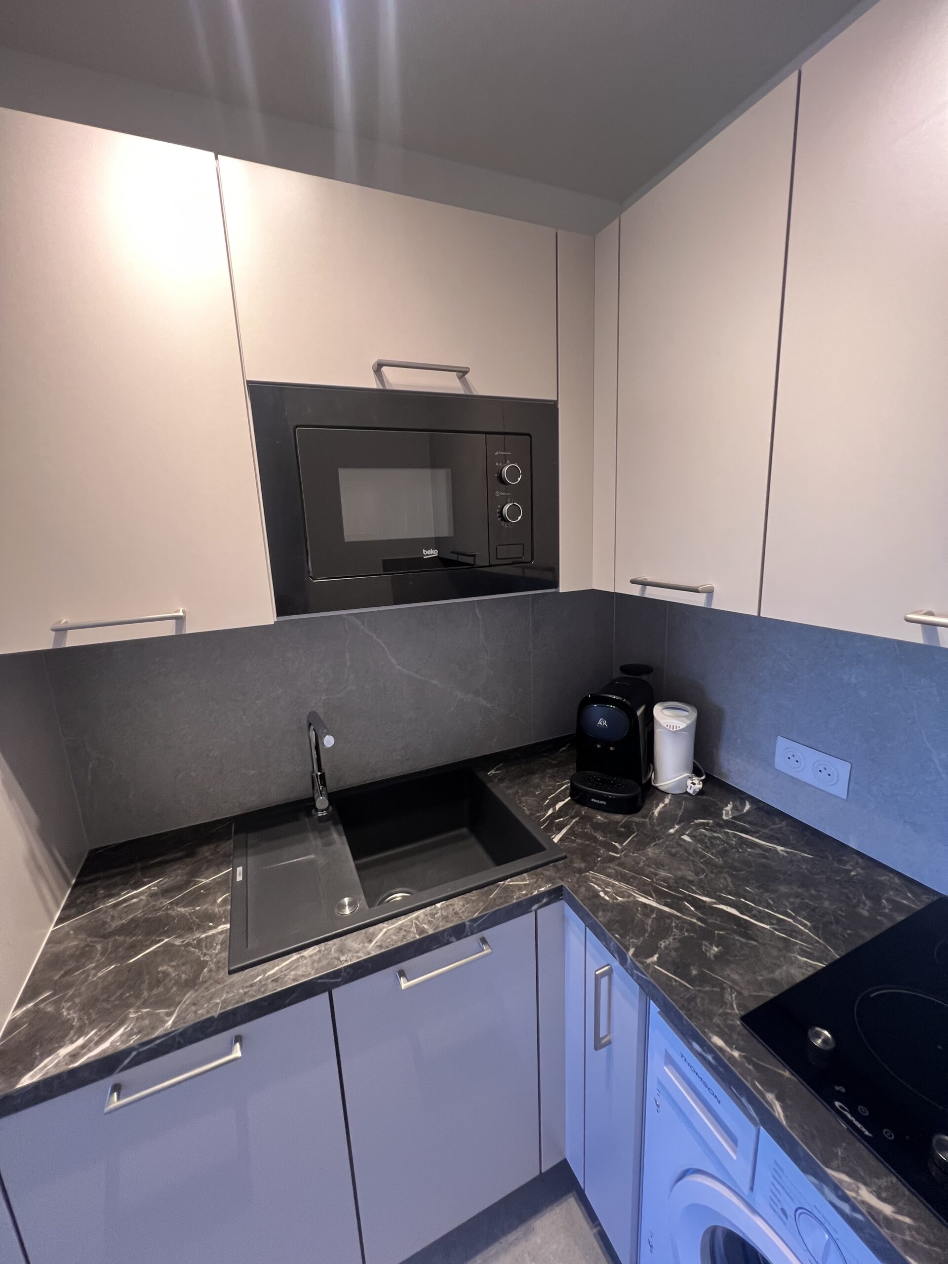 Cuisine : plaques, four, micro-ondes, lave-vaisselle, machine à laver, machine à café.