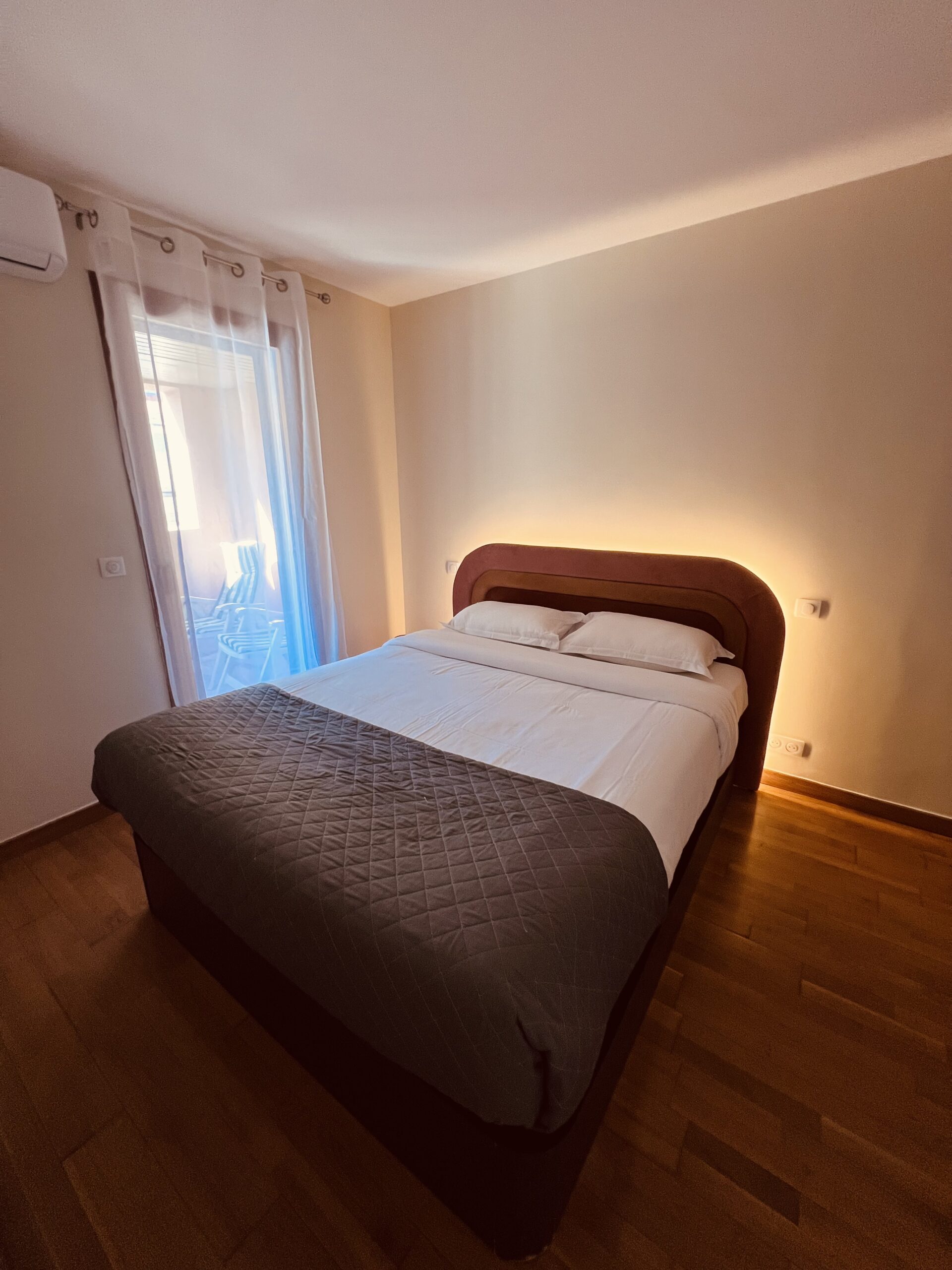 Un petit balcon s’ajoute à l’appartement avec une vue sur un jardin privatif et sur les hauteurs de Cannes.